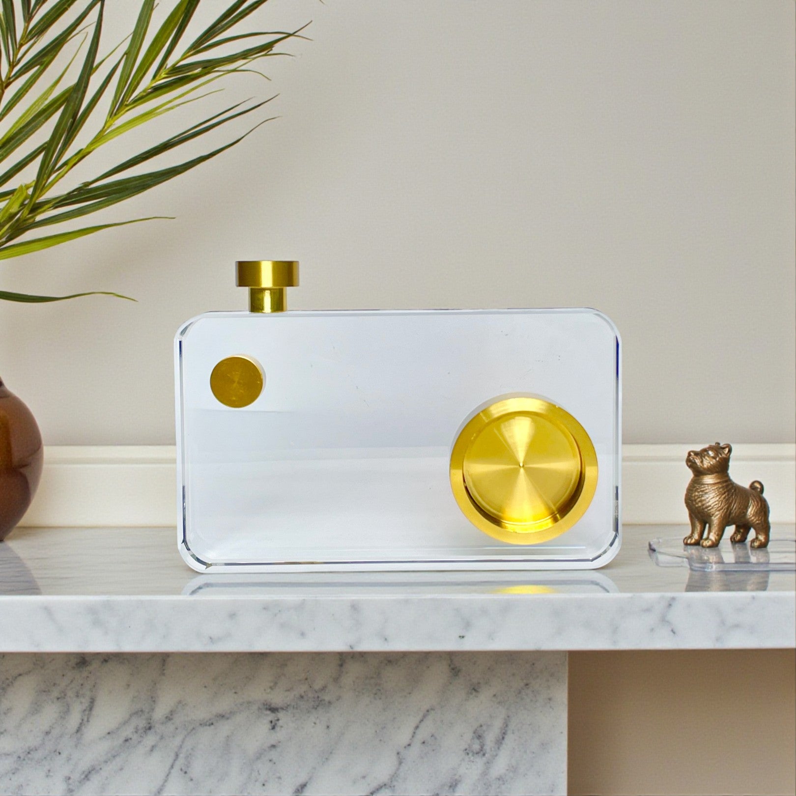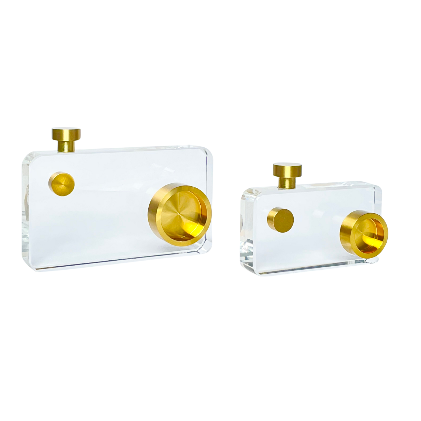 A sleek, contemporary decorative object designed in a rectangular camera silhouette. Crafted from clear, high-quality crystal glass and finished, this piece merges functional inspiration with abstract, modern art for an effortlessly chic accent.