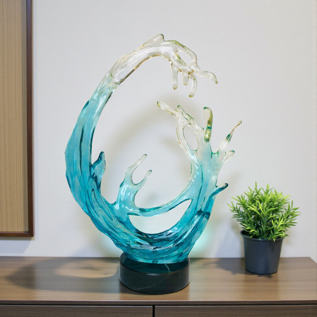 Bring the beauty of the ocean into your space with this stunning crystal wave sculpture. Expertly crafted with fluid curves and a striking blue gradient, it captures the dynamic motion of the sea. Mounted on a solid marble base, this piece serves as a sophisticated decorative accent for living rooms, offices, or display spaces. Its artistic design makes it a statement décor element and a thoughtful gift for art and ocean lovers.