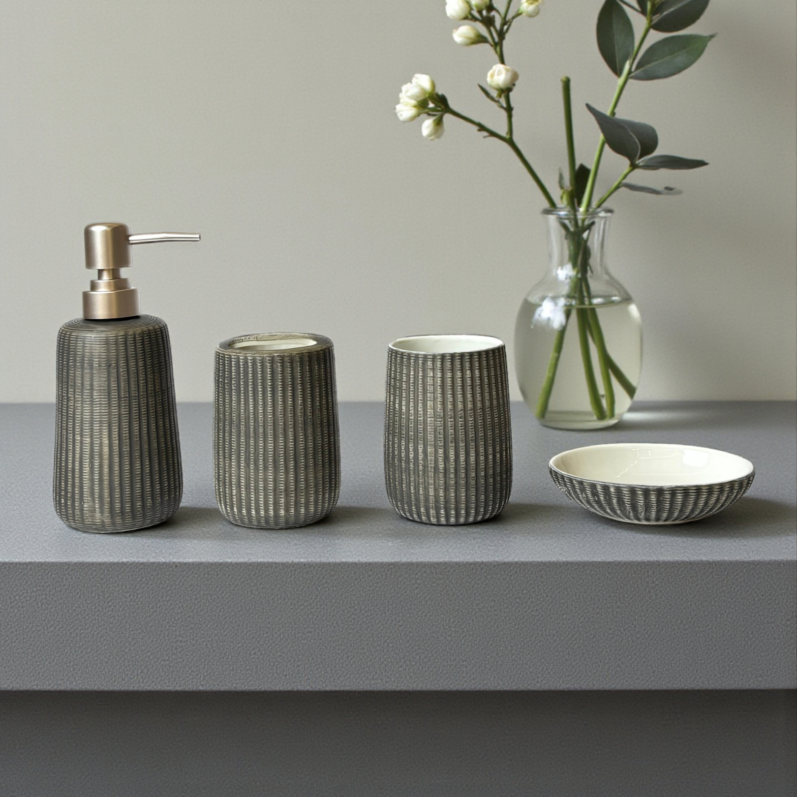 A stylish and functional soap dispenser set designed to elevate your bathroom décor. Perfect for liquid soap, Toothbrush Stand and Soap Tray offering a clean and organized look to your space.